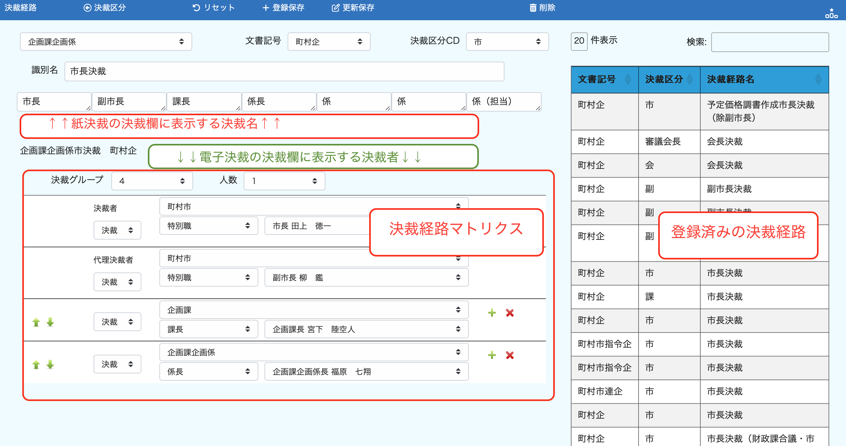 決裁経路は、文書記号の決裁区分ごとに幾つでも設定しておくことができます。また、実際に収受・起案する時に決裁経路は自由に変更することができるため、厳密に設定を作るより基本的な決裁経路だけを登録して構いません。