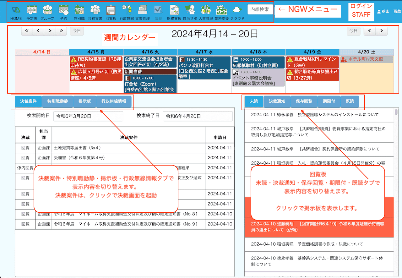 HOMEには、「週間カレンダー」と各種通知関連のINDEXを表示しています。
