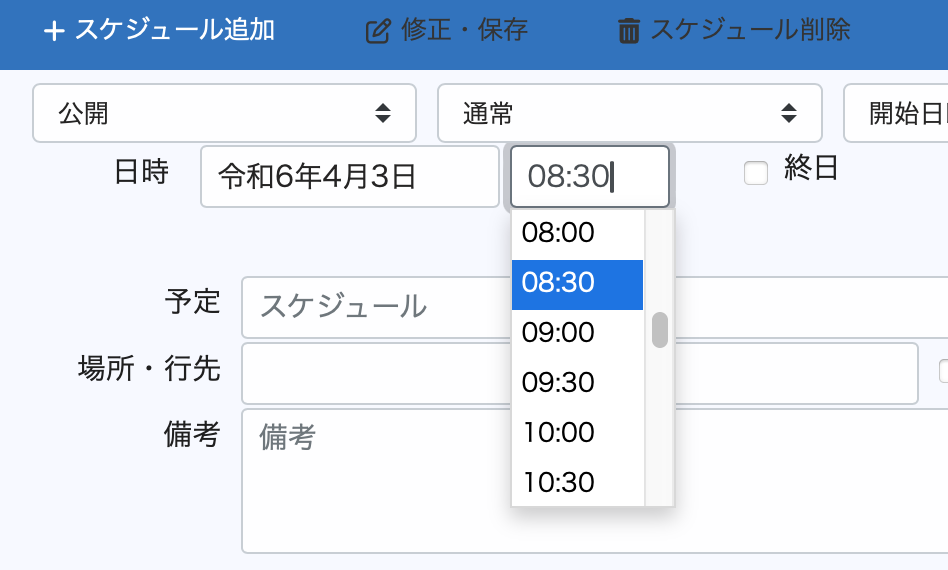 (例 09:05 10:15 のように数字は、前ゼロをつけてで 時と分を : (半角コロン)で区切る)