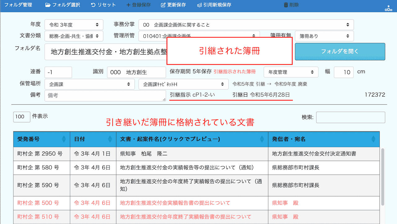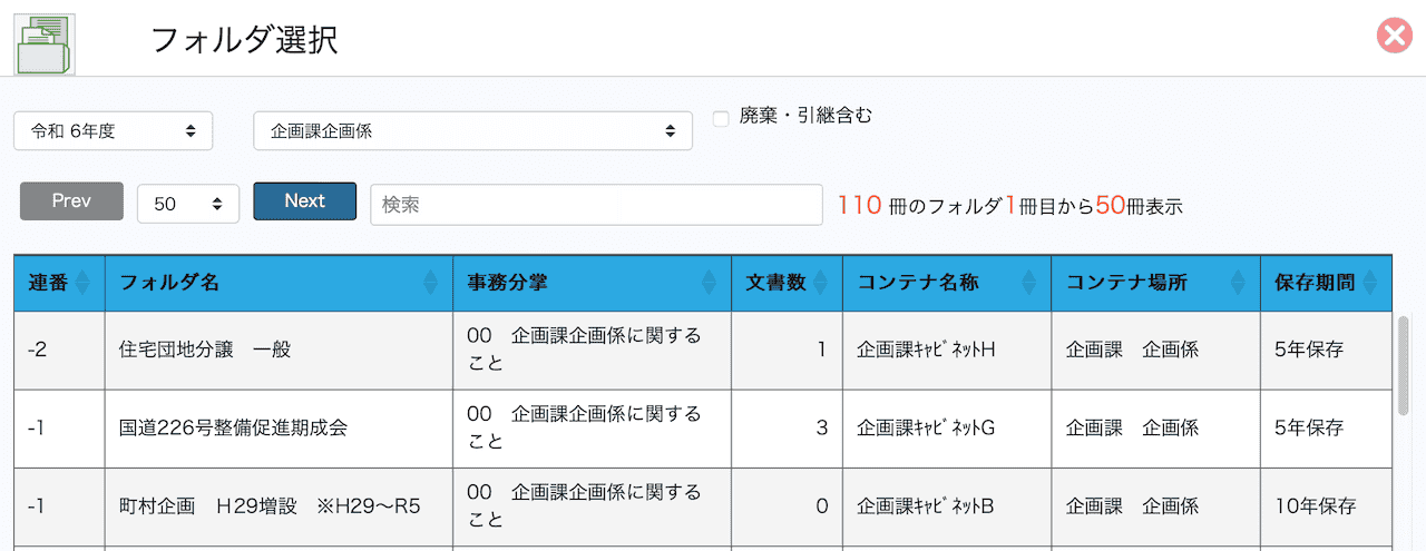 保存年限 簿冊・フォルダに格納する文書の保存年限(引継・廃棄を簿冊単位で行うため、同じ事務分掌で複数の保存年限の文書がある場合は、保存年限ごとに簿冊を登録します)
