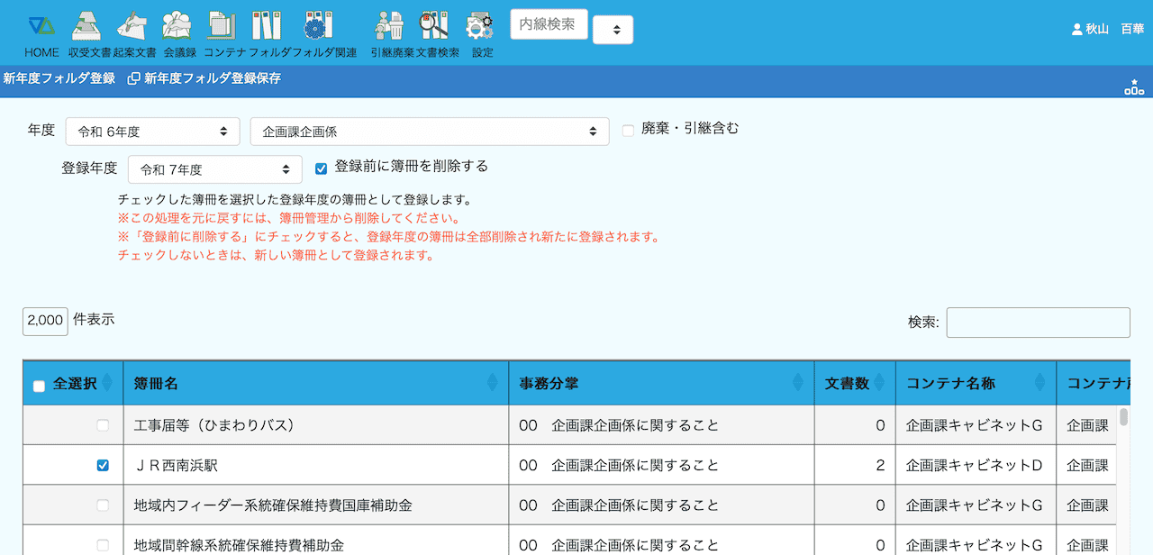 ※「登録前に削除する」にチェックすると、登録年度の簿冊は全部削除され新たに登録されます。