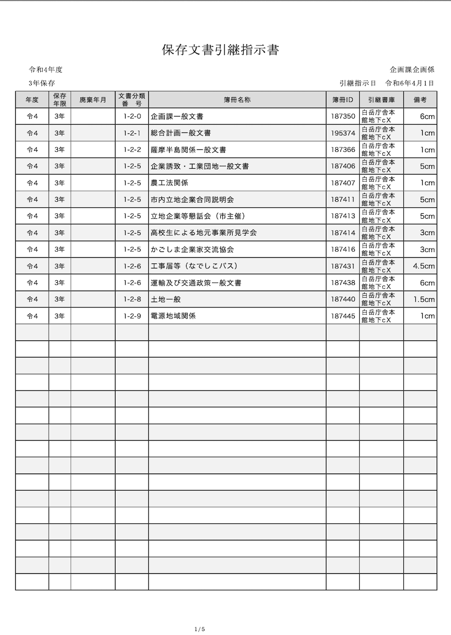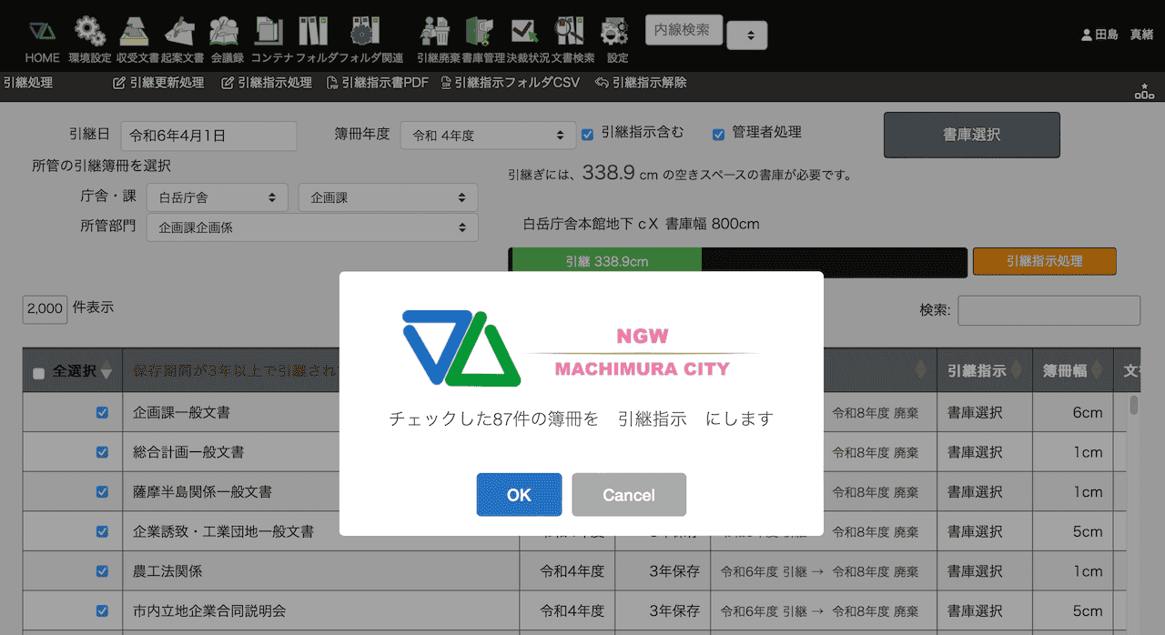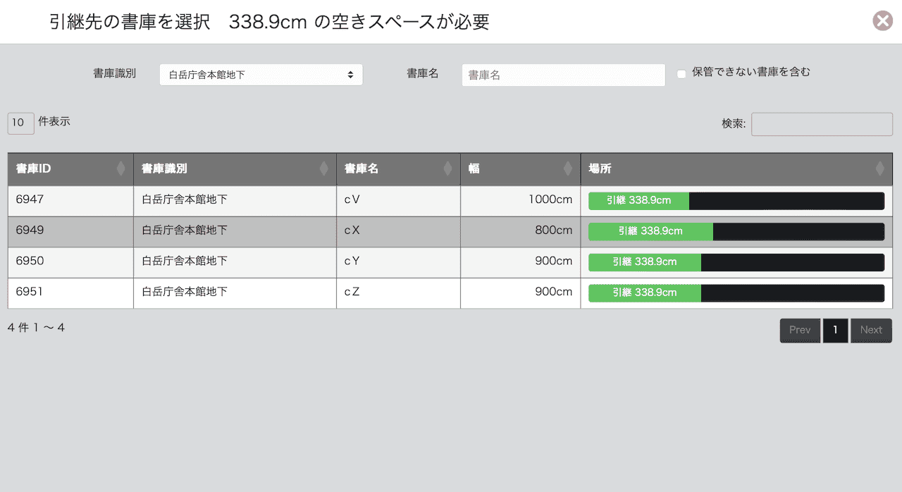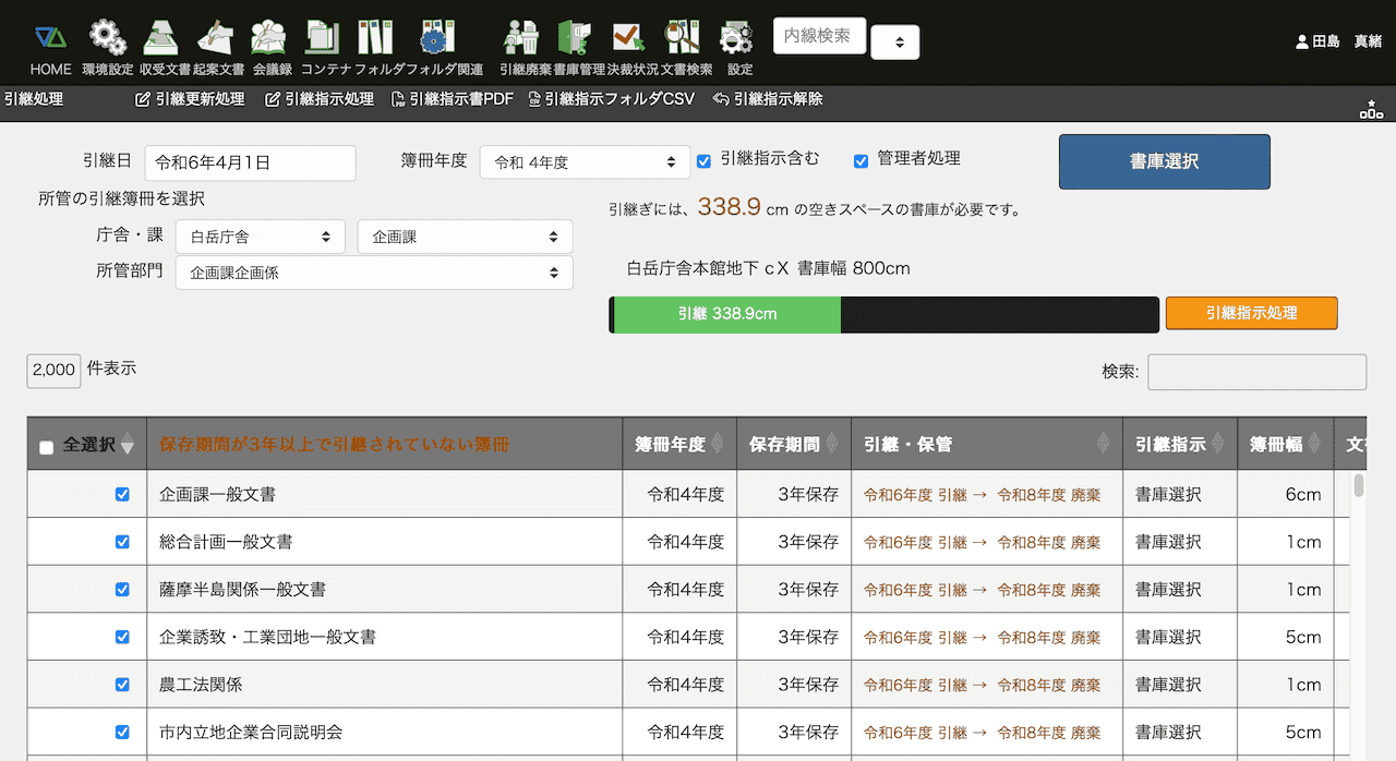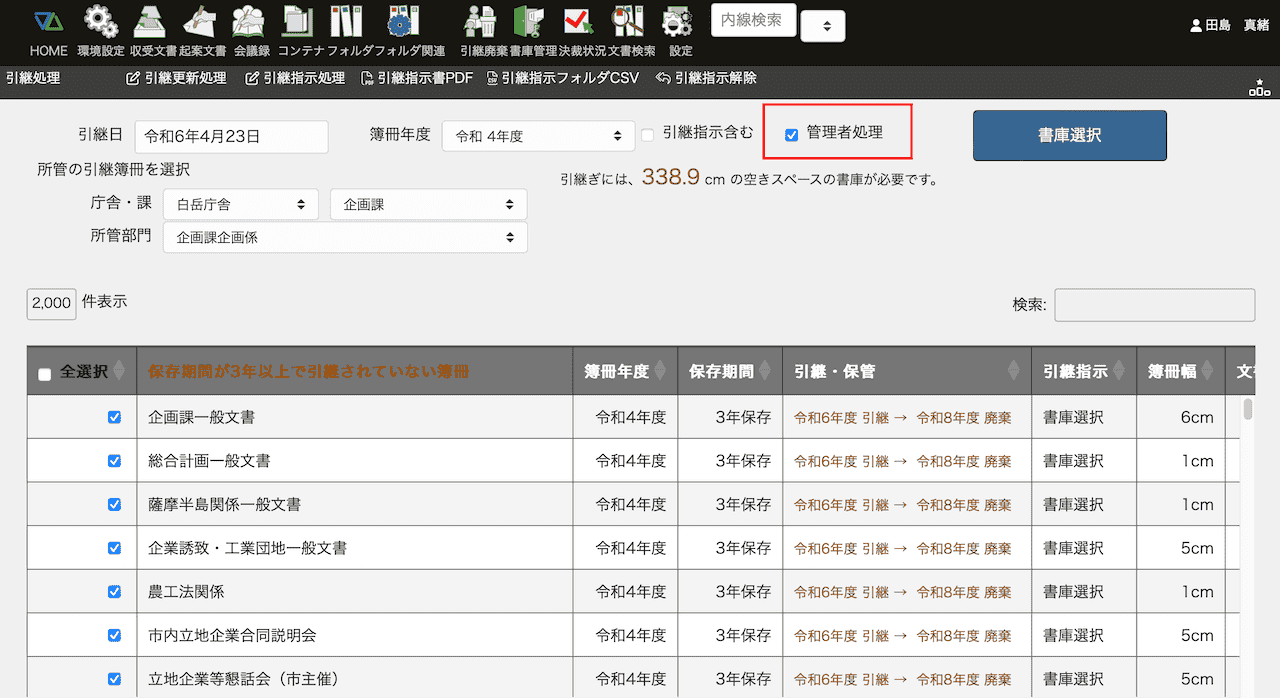 文書管理部門の職員には、管理者処理チェックボックスが表示されます。チェックすることで管理者処理を実行できます。申請のあった「引継目録」をもとに、引継先の書庫を設定します。① 書庫に保管する簿冊を選択します。選択した簿冊の合計幅が表示されますので、必要な空きスペースの書庫を選択して設定できます。② 「書庫選択ボタン」をクリックします。