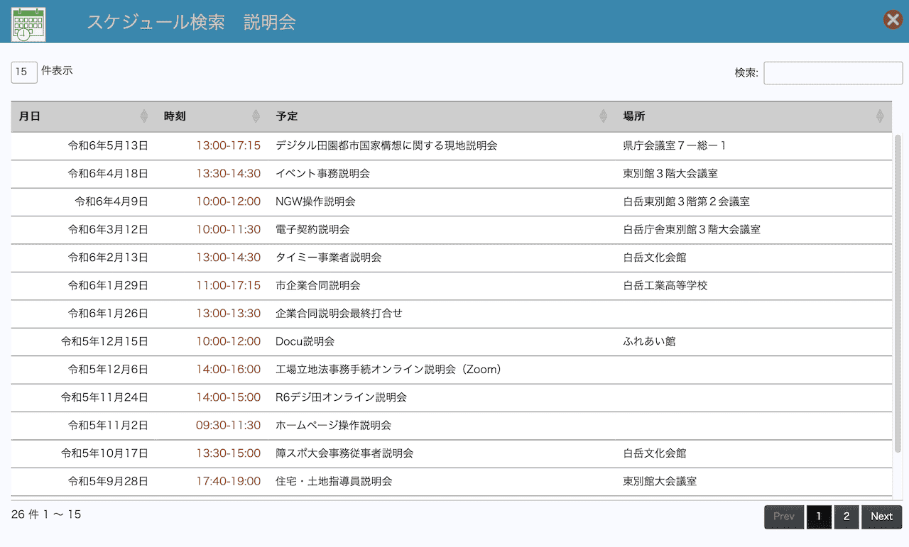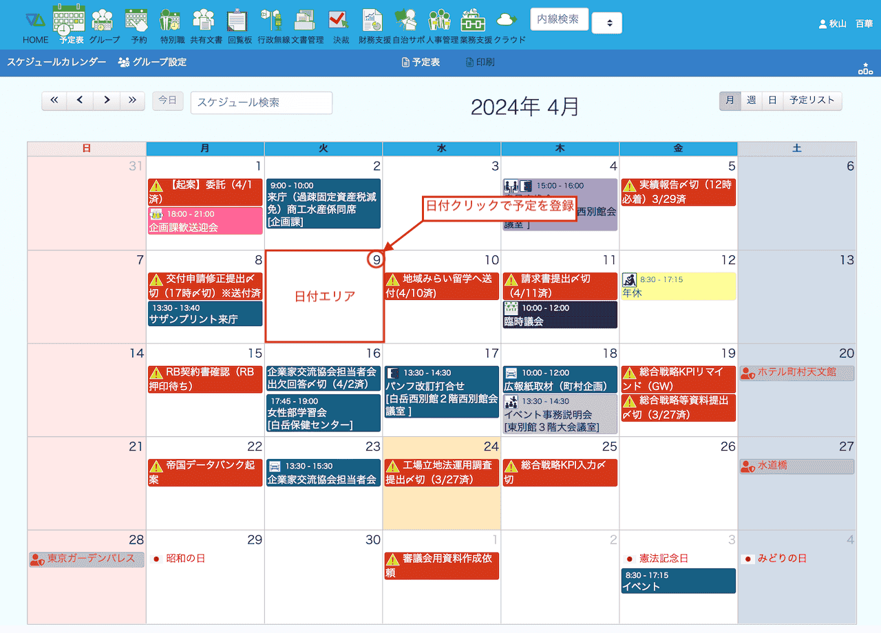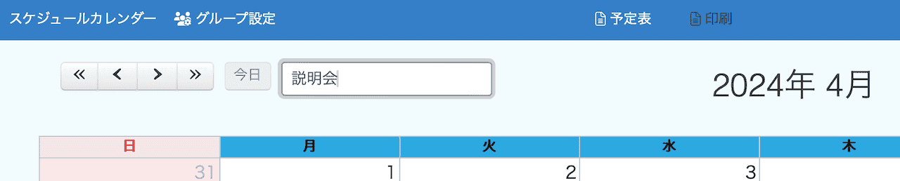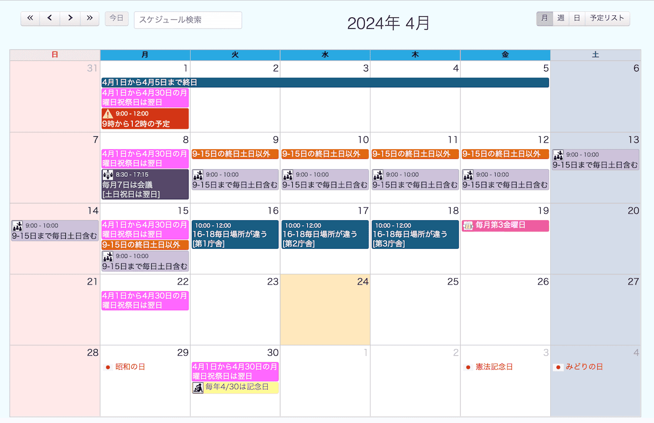 スケジュールカレンダー上部の「スケジュール検索」に検索文字列を入力してエンターキーを押すと過去のスケジュールを含むスケジュールから検索します。