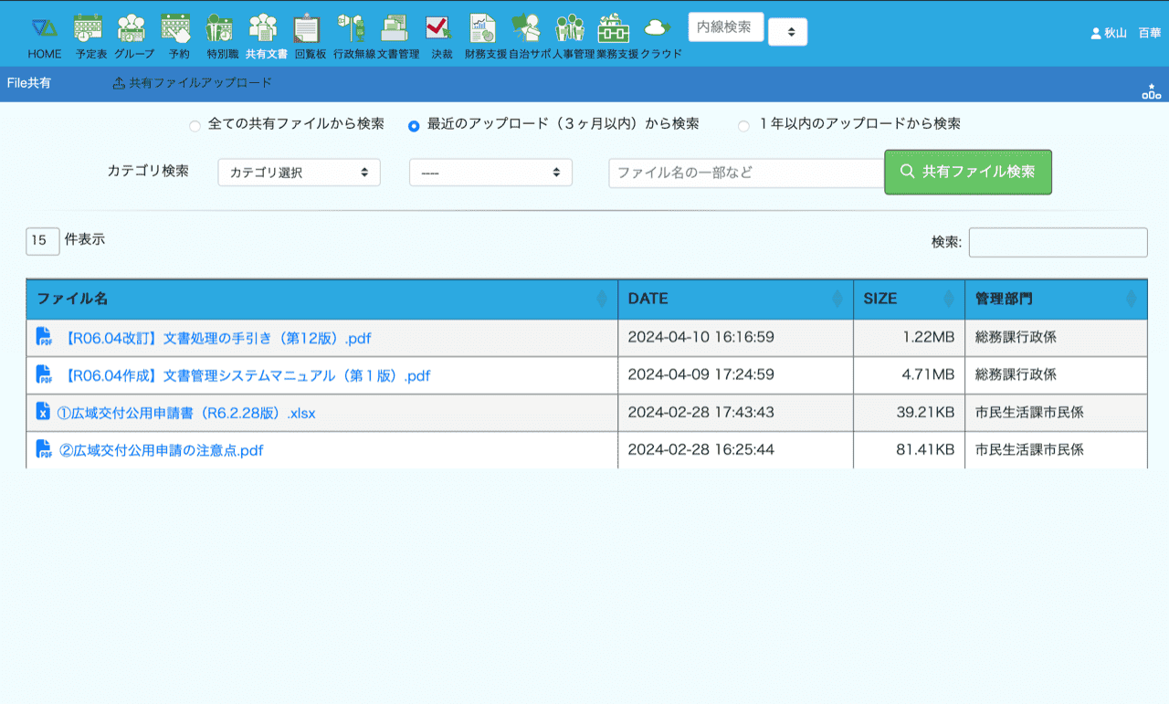 カテゴリーとサブカテゴリーを選択すると、メニューの「共有ファイルアップロード」でアップロード画面が表示されます。