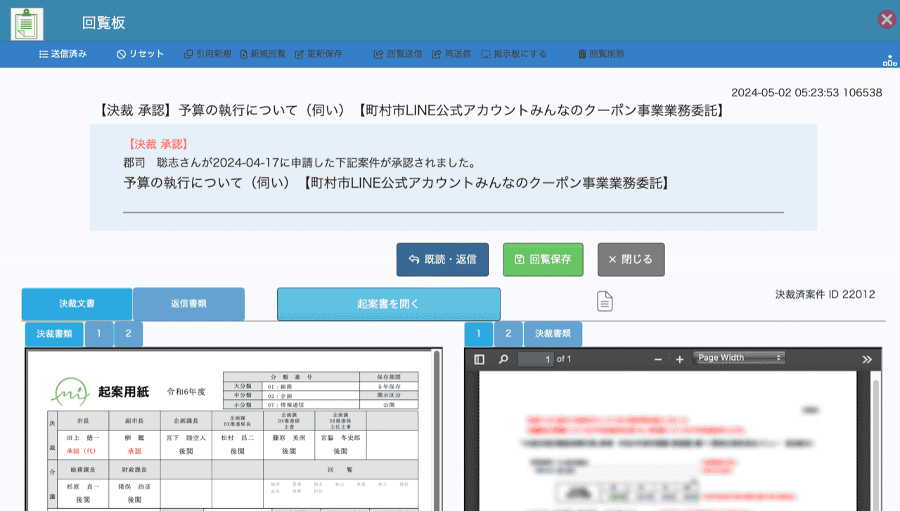 決裁が完了すると回覧板で結果を申請者に配信します。