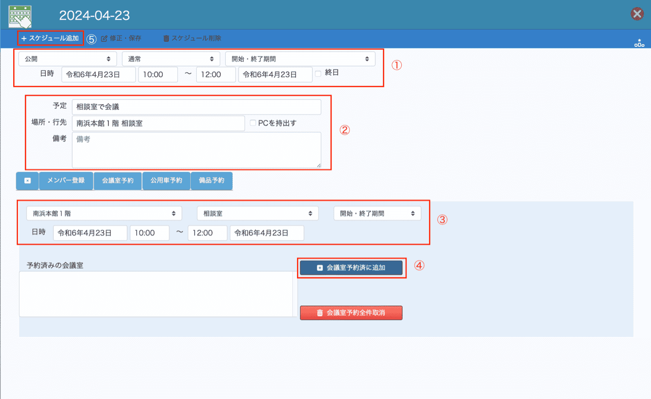 ② 予定、場所・行先、備考を入力しますが、会議室からの予約では、場所・行先に会議室名が入力されています。