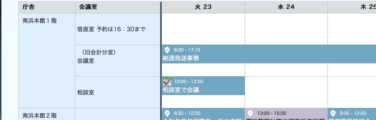 予約するには、予約する設備の日付エリアをダブルクリックします。左の図では、相談室を4月23日に予約出来ます。