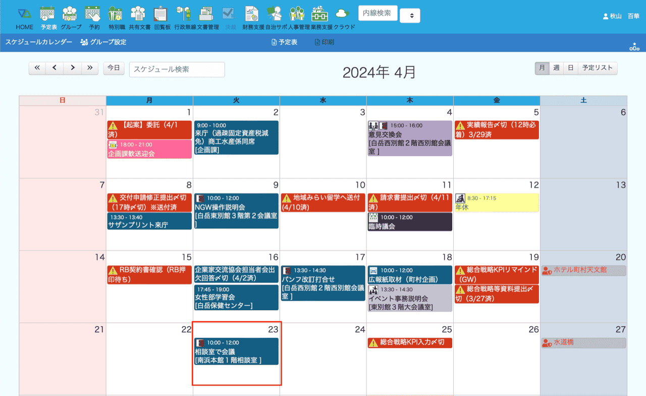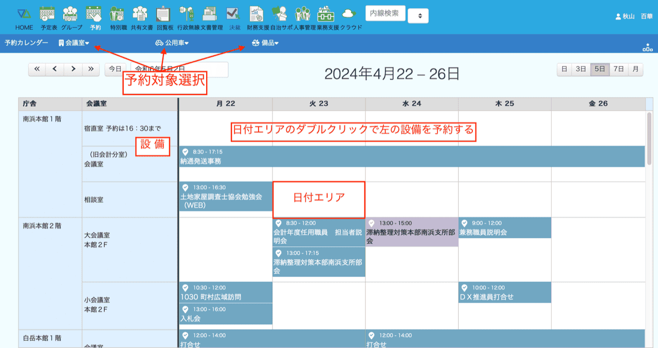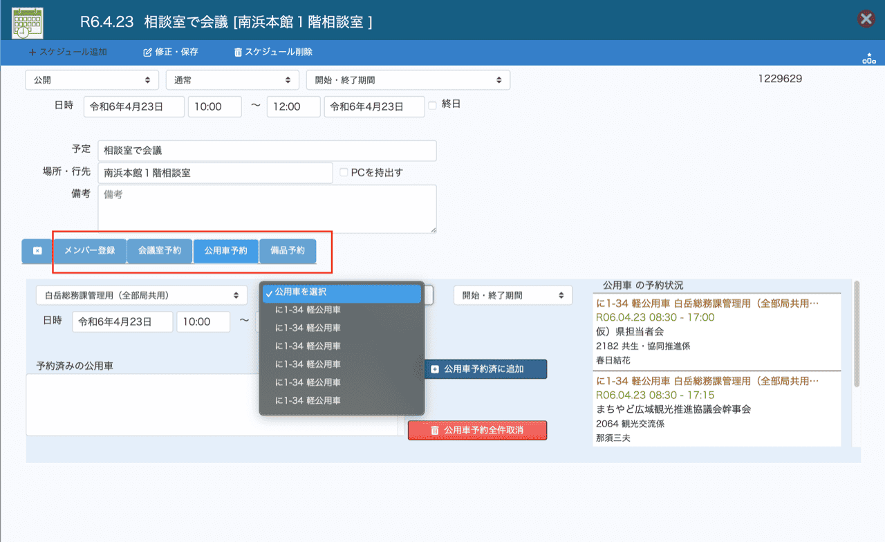 同じ予定から複数の予約をすることができます(会議室と公用車、備品など)