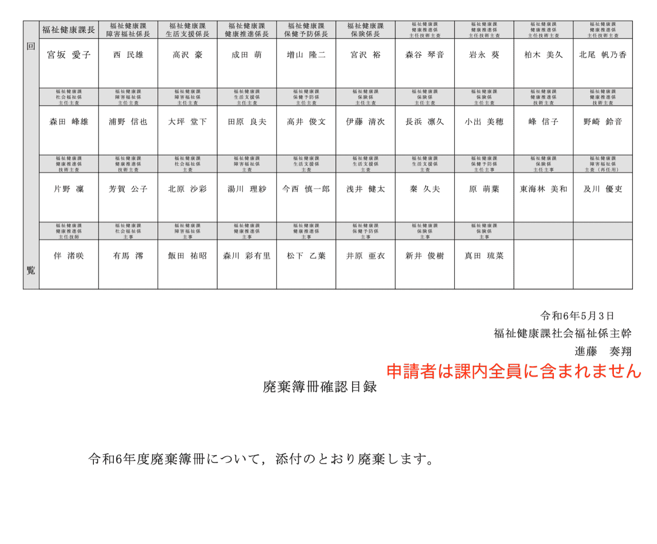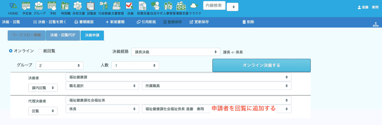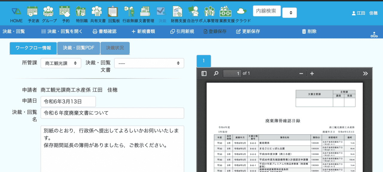 例えば、廃棄書類リストを文書管理担当へ提出するための決裁、内部監査結果などの課内全職員で決裁・回覧する書類、書類をスキャンしてPDFで回覧する書類などです。