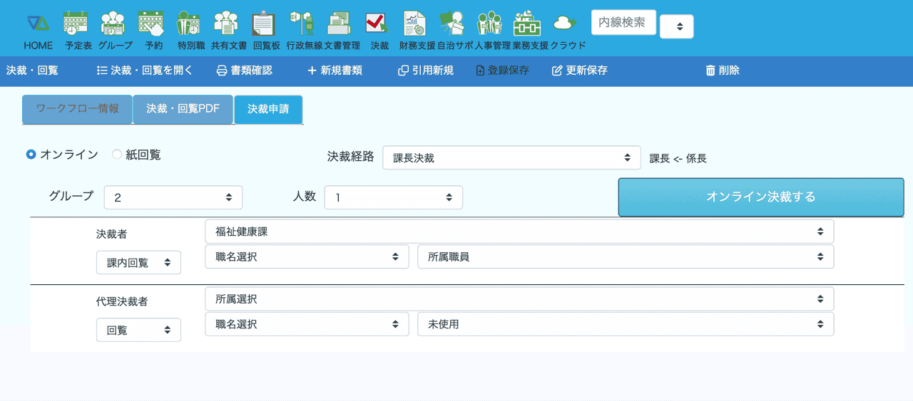 オンライン決裁は通常の起案書などと同じで、書類と添付書類が表示され、既読処理や承認処理ができます。